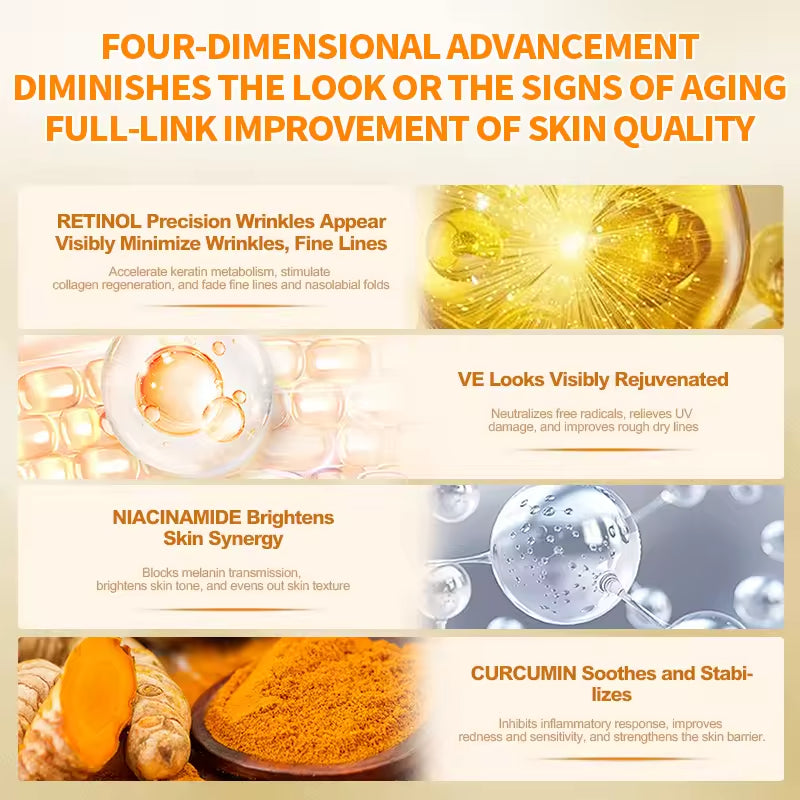 Retinol (Vitamin A Alcohol): The anti-aging star! Accelerates keratin metabolism and boosts collagen production to visibly minimize fine lines, wrinkles, and nasolabial folds. It also regulates oil to keep pores clear.